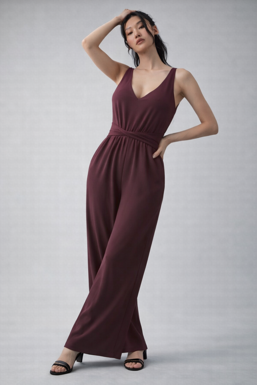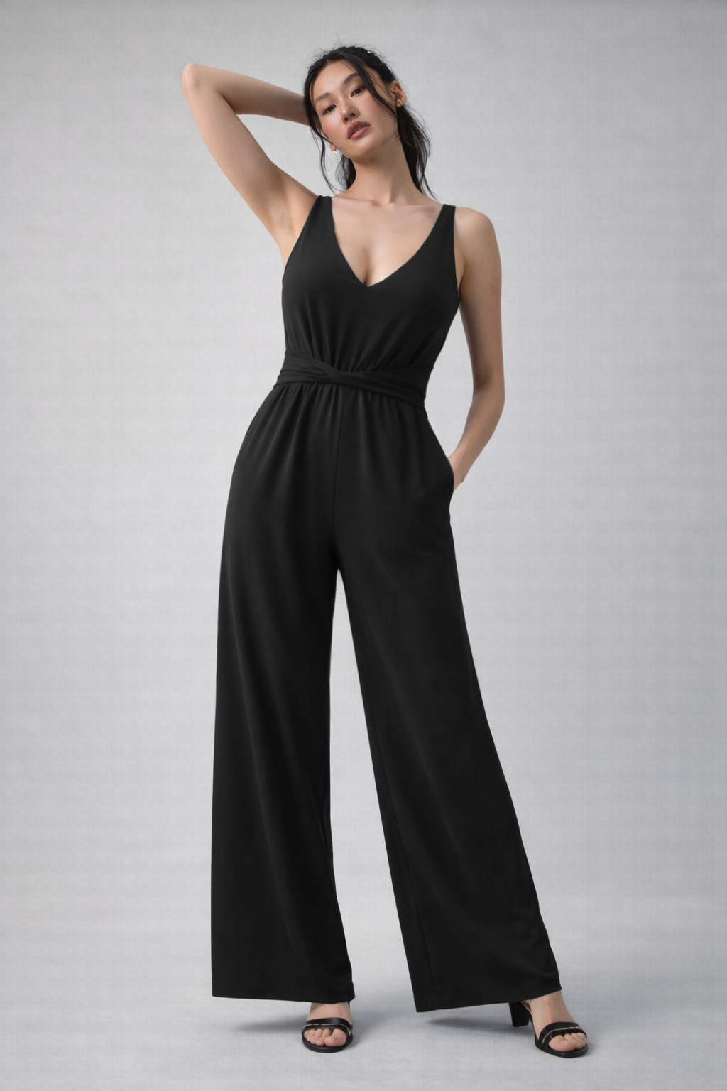 Enterizo palazzo diseñado para realzar la silueta con naturalidad y elegancia, con escote en V que estiliza con sutileza, mientras que la cinturilla con doblez entalla delicadamente el torso, definiendo la figura sin perder fluidez.